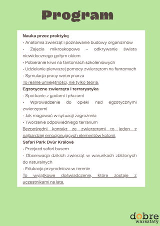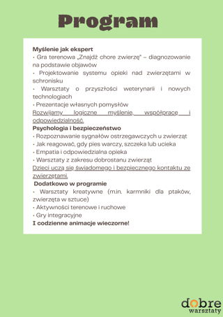 Podczas 7 dni niezwykłej przygody ze zwierzakami dzieci wcielą się w przyszłych weterynarzy i opiekunów, ucząc się, jak rozpoznawać potrzeby zwierząt, jak im pomagać i jak się nimi odpowiedzialnie zajmować – od podstaw anatomii i pielęgnacji po pierwszą pomoc, dietę i zachowanie 🐾 🐶